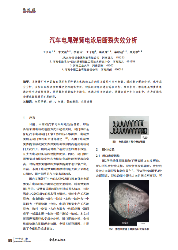 鞏義市恒銘金屬制品有限公司2022年在金屬加工‘熱加工’第11期雜志上發(fā)表了一篇名為“汽車電尾彈簧電泳后斷裂失效分析”的論文。